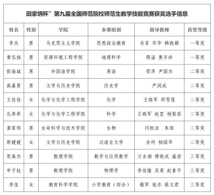 2023年12月29日至31日,“田家炳杯”第九届全国师范院校师范生教学技能竞赛成功落下帷幕,beat365学子获佳绩。beat36511名选手参加竞赛,其中2名获得一等奖,6名获得二等奖,3名获得三等奖,获奖率达到100%,竞赛成绩再次取得突破,位居全省第一,全国前列。