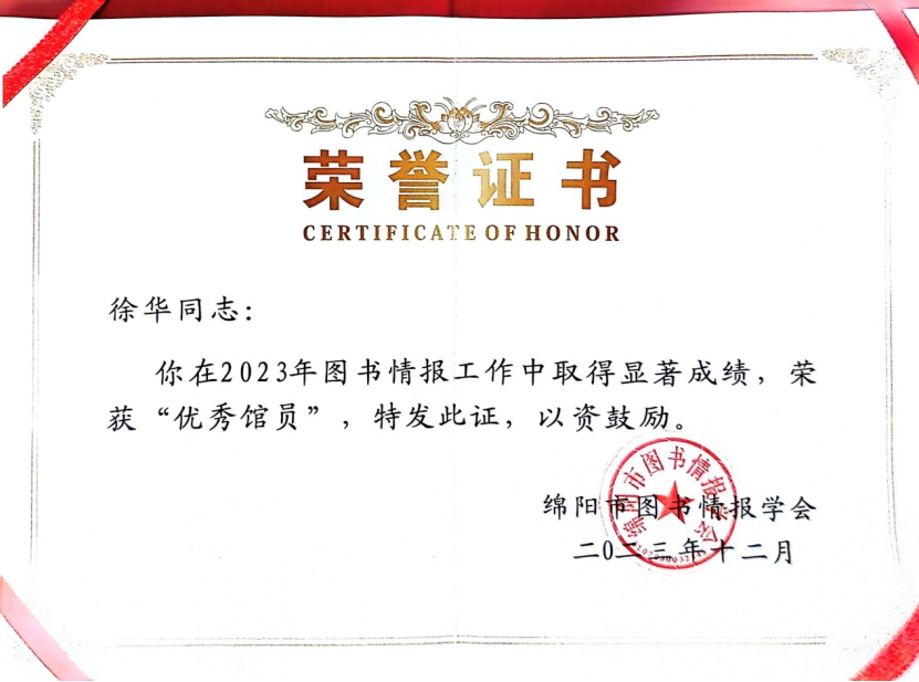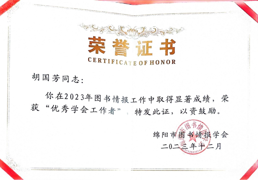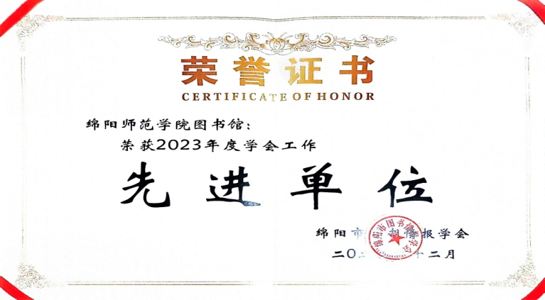 1月11日—12日,绵阳市图书情报学会召开 2023 年工作总结会。会议表彰了先进集体和先进个人,beat365图书馆荣获“2023年度学会工作先进单位”,图书馆副馆长胡国芳同志荣获“优秀学会工作者”称号,图书馆科技咨询中心主任徐华同志荣获“优秀馆员”称号。