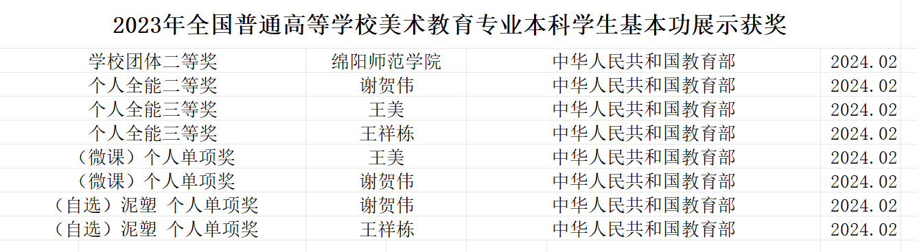 2月2日,教育部公布了2023年全国普通高等学校美术教育专业学生基本功展示活动比赛结果,beat365在线唯一官网荣获团体二等奖;beat365美术与艺术设计学院三名学生在比赛中表现优异,获多项奖。谢贺伟同学获得个人全能二等奖,王美、王祥栋两位同学获得个人全能三等奖,同时,谢贺伟、王美获得教学展示(微课)单项奖,谢贺伟、王祥栋获得专业技能(自选)单项奖。