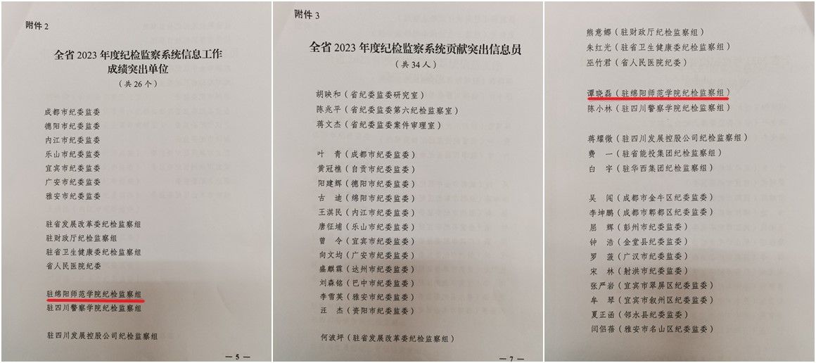 近日,中共四川省纪委办公厅印发《关于表扬2023年度全省纪检监察系统信息工作成绩突出单位和个人的通报》,驻校纪检监察组荣获全省2023年度纪检监察系统信息工作成绩突出单位,谭晓磊同志被评为全省2023年度纪检监察系统贡献突出信息员。全省仅有2家高校派驻机构荣获信息工作成绩突出单位,2位同志被评为贡献突出信息员,这是继去年驻校纪检组荣获全省纪检监察系统信息工作先进单位、谭晓磊同志荣获全省纪检监察系统优秀信息员奖励后的又一新殊荣。