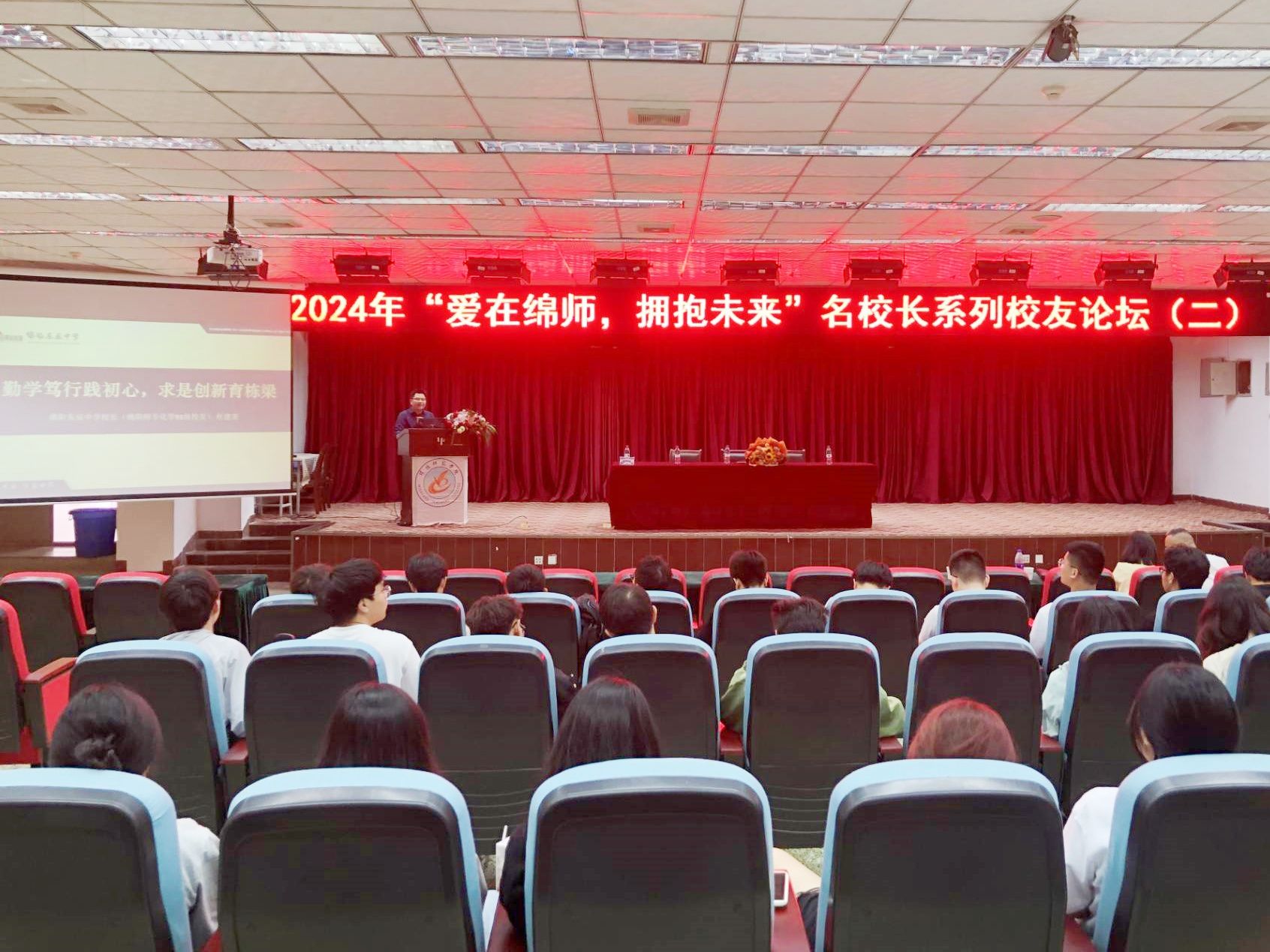 4月26日上午,由校友工作办公室主办,党委学生工作部、教务处、教师发展中心协办,化学与化学工程学院承办的beat365在线唯一官网2024“爱在绵师,拥抱未来”校友论坛-校长讲堂专场活动在游仙校区三教学术报告厅举行,beat365化学系1993级校友、绵阳东辰学校高中部校长杜建奎应邀做分享报告,校友工作办公室负责人、化学与化学工程学院党政负责人、教师代表、游仙校区各学院学生代表近200人参加。