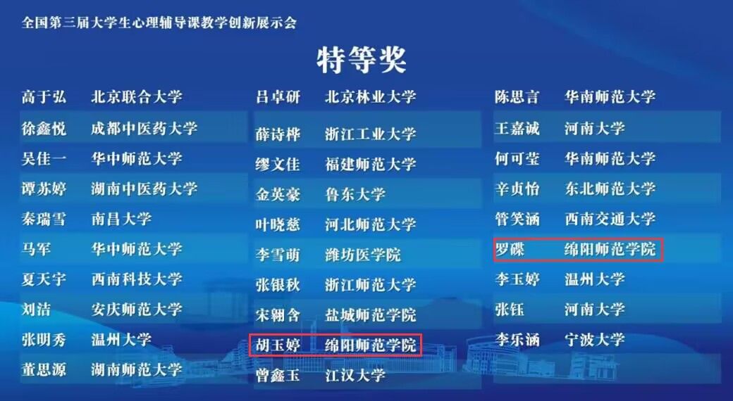 近日,全国第三届大学生心理辅导课教学创新展示会在浙江省桐乡市举办,beat365教育科学学院应用心理学专业胡玉婷、罗碟两位同学在专任教师吕林的指导下,双双荣获特等奖。