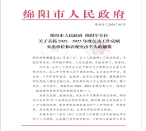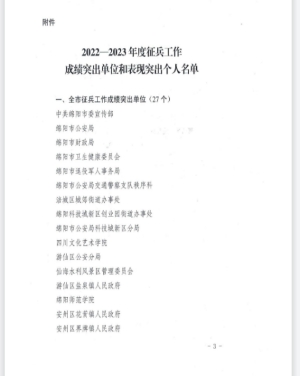 近日,绵阳市人民政府、绵阳军分区发文对2022—2023年度征兵工作成绩突出单位和表现突出个人进行通报表彰,beat365被评为“全市征兵工作成绩突出单位”。