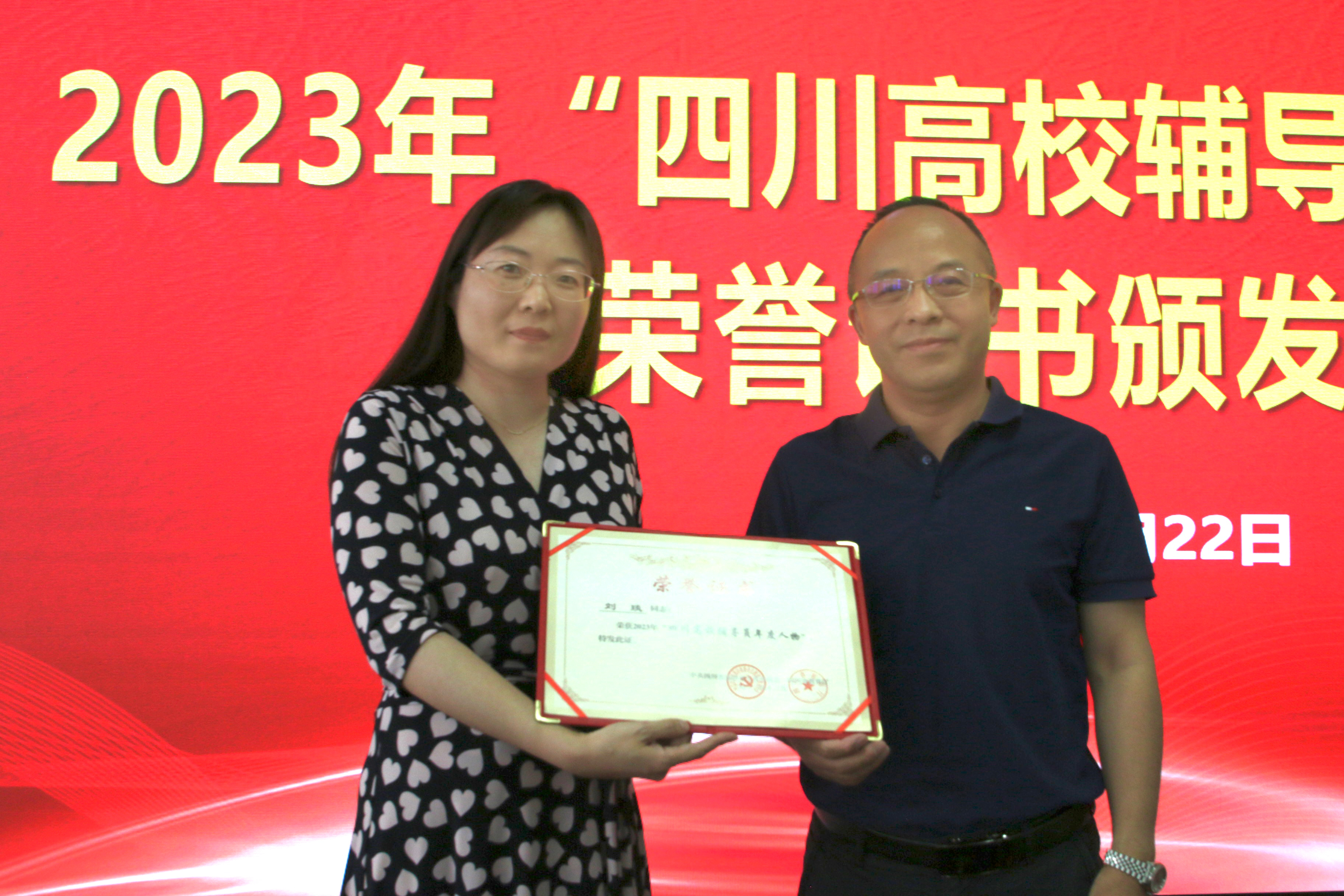 仪式上,陈寒向beat365获得2023年“四川高校辅导员年度人物”殊荣的传媒学院党委副书记、纪委书记刘琰同志颁发荣誉证书,代表学校党委和行政向刘琰同志表示祝贺,向辛勤工作在辅导员岗位上的同志们表示问候。