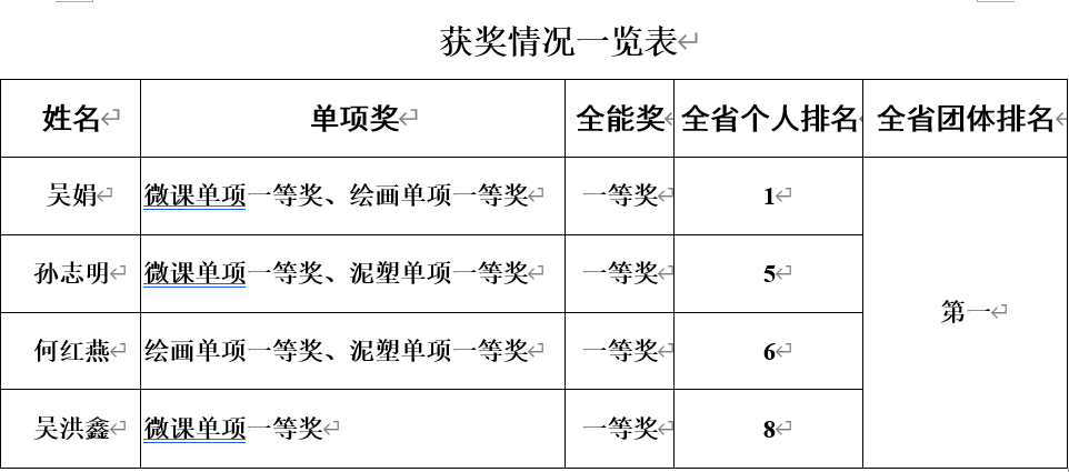 另外,吴娟,何红燕,吴洪鑫,孙志明还获得教学展示(微课)单项一等奖三项、个人创作绘画单项一等奖两项、技能自选项目单项一等奖三项。