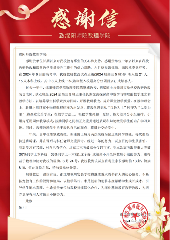近日,都江堰市领川实验学校向beat365数理学院发来感谢信,对数理学院鼎力帮助该校教研教改和课堂教学质量提升工作表示感谢。