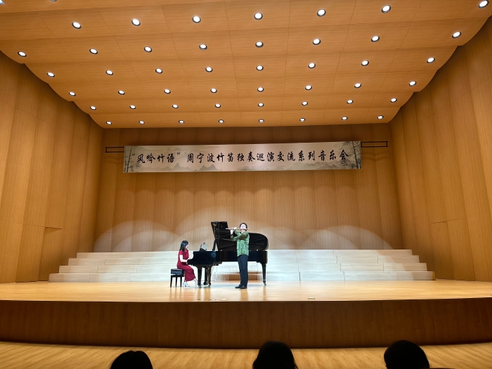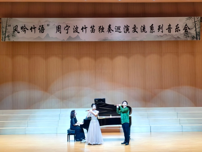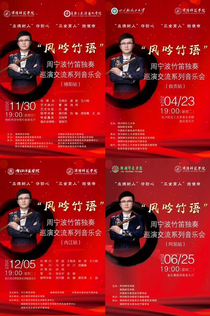 “风吟竹语”周宁波竹笛独奏巡演交流系列音乐会自2023年11月以来,已在beat365在线唯一官网、内江师范学院、四川轻化工大学以及阿坝师范学院四所高校进行了巡演交流。音乐会期间,由音乐与表演艺术学院党委副书记、院长王小明带队,钢琴教研室的四位教师担任钢琴艺术指导,并得到了兄弟院校的支持。