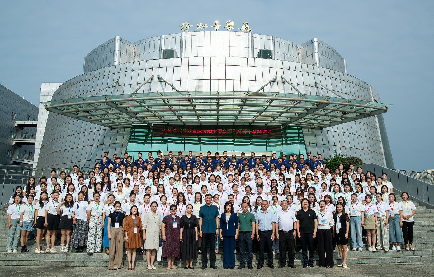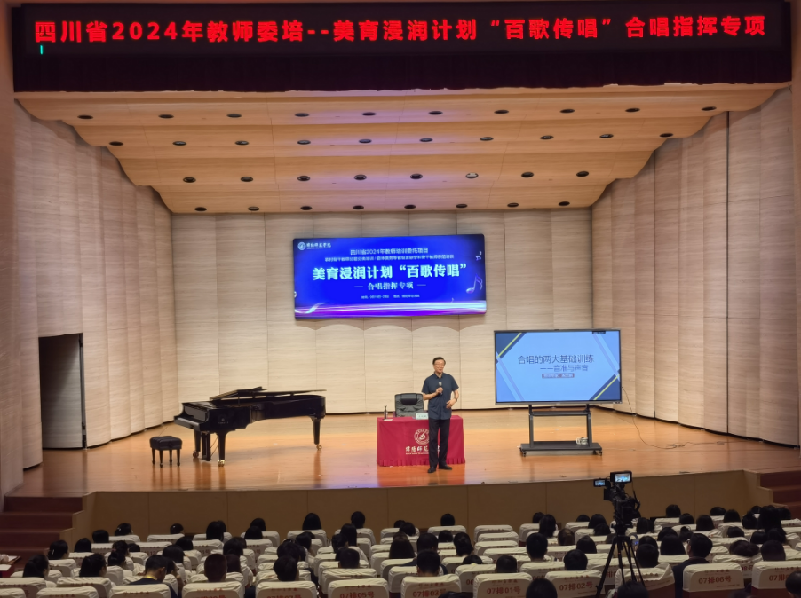 9月19日,受四川省教育厅委托,学校承办的四川省2024年教师培训委托项目——农村骨干教师分层分类培训音体美劳等省级紧缺学科骨干教师示范培训(美育浸润计划“百歌传唱”专项合唱指挥骨干教师培训)正式开班。四川省教育厅副厅长蔡光洁,学校党委副书记、校长陈寒,著名指挥家孟大鹏出席开班仪式。省教师发展中心、教育厅体卫艺处相关负责人,beat365在线唯一官网继续教育学院、音乐与表演艺术学院相关负责人,培训项目指导教师以及来自全省21个地市州的200名中小学音乐教师参加开班仪式。