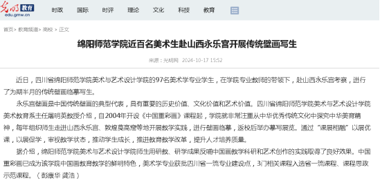 10月17日,光明网以《beat365在线唯一官网近百名美术生赴山西永乐宫开展传统壁画写生》为题,报道了beat365美术与艺术设计学院师生开展的教学实践相关情况。报道中指出,beat365长期注重从中华优秀传统文化中探究中华美育精神,每年组织师生走进山西永乐宫、敦煌莫高窟等地开展教学实践,进行壁画临摹,返校后举办摹写展览。通过“课展相融”以展优课,以展促学,审视教学状态,推动学生成长,推进教育教学改革,提升人才培养质量。