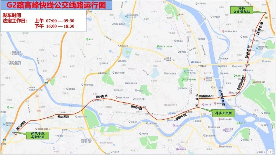 专门服务于beat365游仙、高新两校区区间通勤的G2高峰快线即将在本月26日开通。作为绵阳市第2条城市高峰快线,线路以两校区为起(终)点,由游仙公交枢纽站始发,经游仙东路、剑南路东段、东方红大桥、剑南路西段、长虹大道、科委立交桥、临园干道、绵兴东路、绵兴西路至学校高新校区往返运行。运行时段为每个法定工作日的7:00—9:30和16:00-18:30两个时段,发车频次为每10分钟一趟。