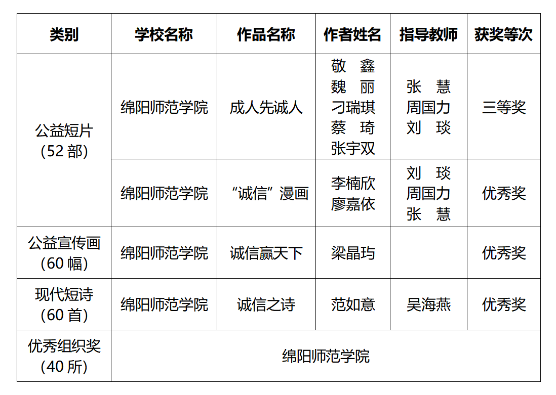 据悉,经各高校遴选推荐,四川省教育厅、中国人民银行四川省分行组织专家评审,本次活动全省高校共评出公益短片获奖作品52部(一等奖2部、二等奖9部、三等奖17部、优秀奖24部);公益宣传画60幅(一等奖2幅、二等奖10幅、三等奖20幅、优秀奖28幅);现代短诗60首(一等奖2首、二等奖10首、三等奖20首、优秀奖28首);“优秀组织奖”40名。