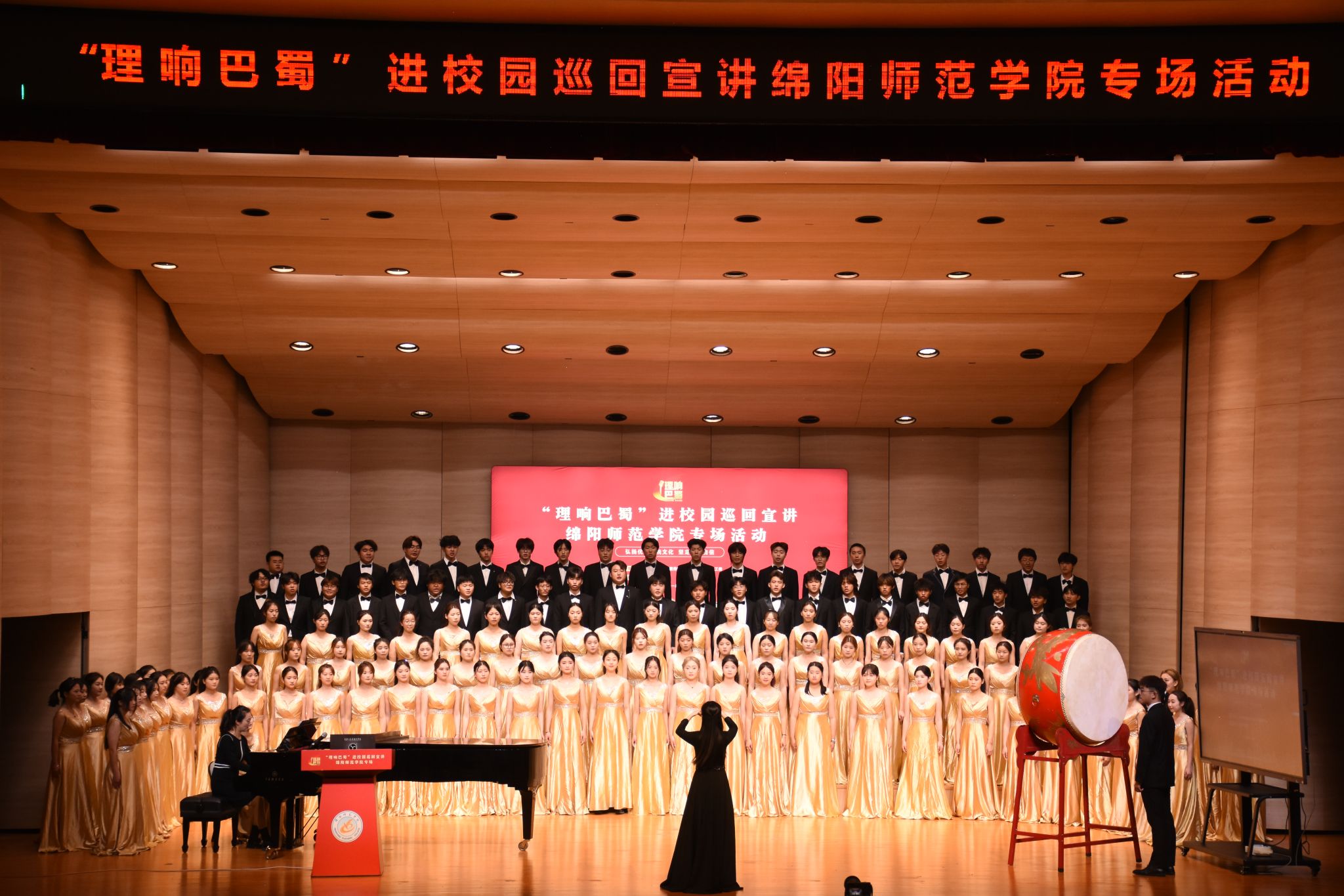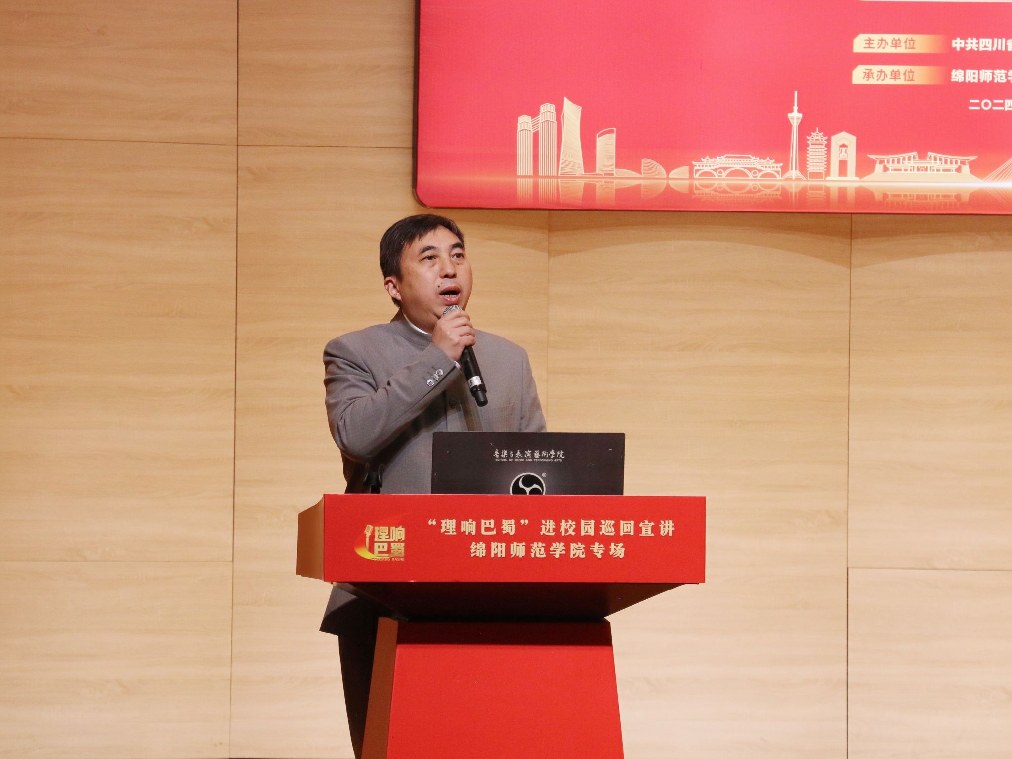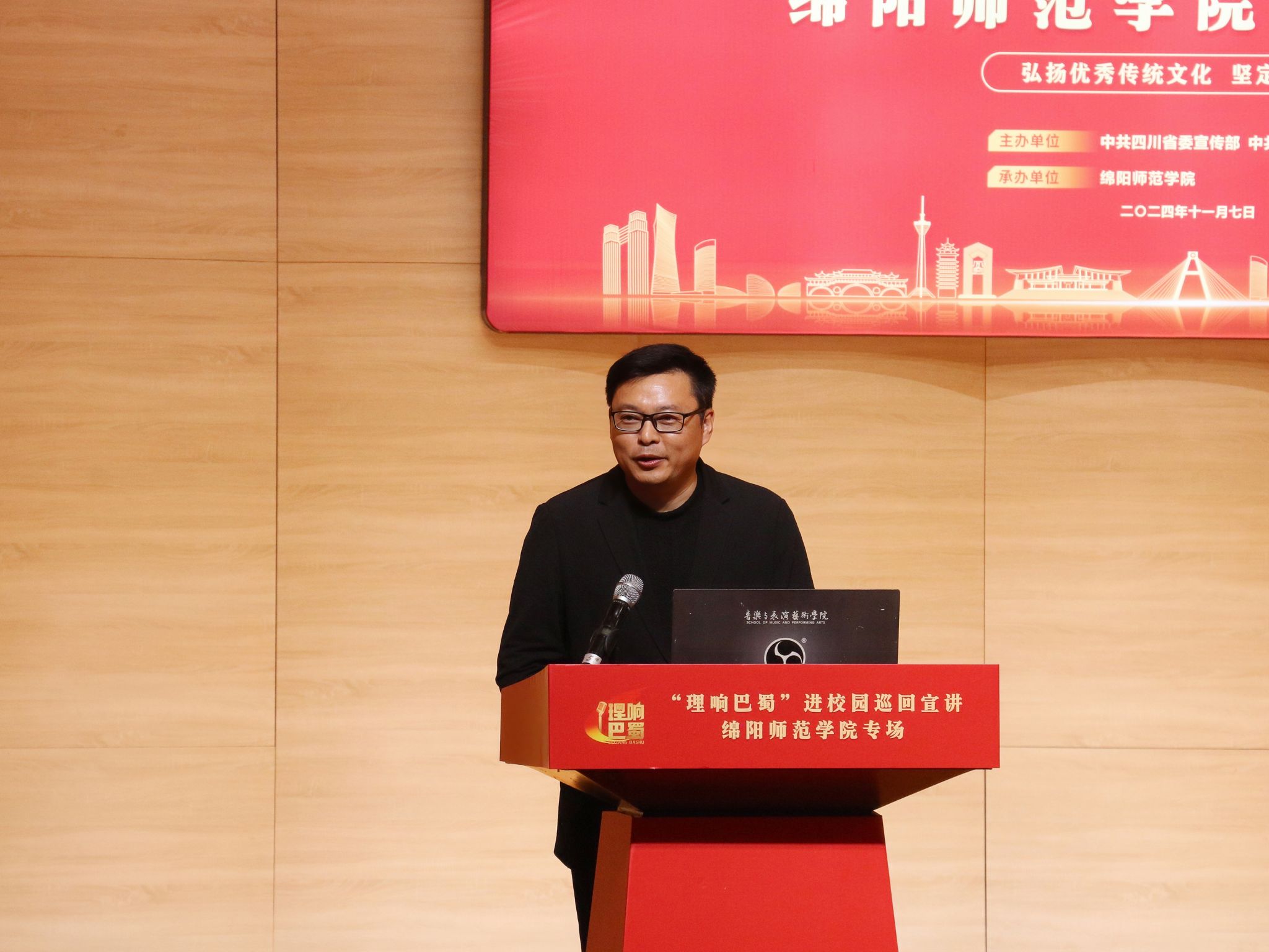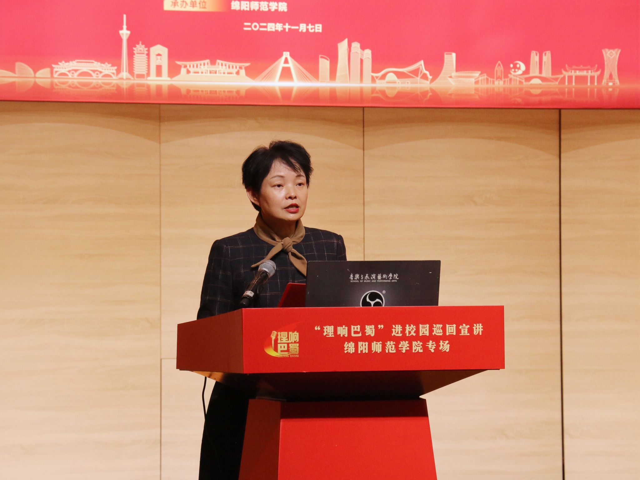 乐山师范学院音乐学院副院长吴映春以“中国声音 巴蜀音韵”为题,深入探讨了巴蜀音乐的文化背景及其主要体裁形式。宣讲不仅配以笛子独奏等精彩表演,还邀请了青年花腔女高音朱荟钱老师演绎了民歌《布谷鸟儿咕咕叫》。朱荟钱以其清脆、秀丽且充满活力的唱腔,为听众带来了饶有趣味的听觉享受。宣讲的高潮部分,吴映春演唱《四川人的龙门阵》,其歌声高亢嘹亮,歌词朗朗上口,引领大家深入体验了巴蜀音乐的迷人韵律,领略了巴蜀地区音乐风格与文化内涵的独特魅力。