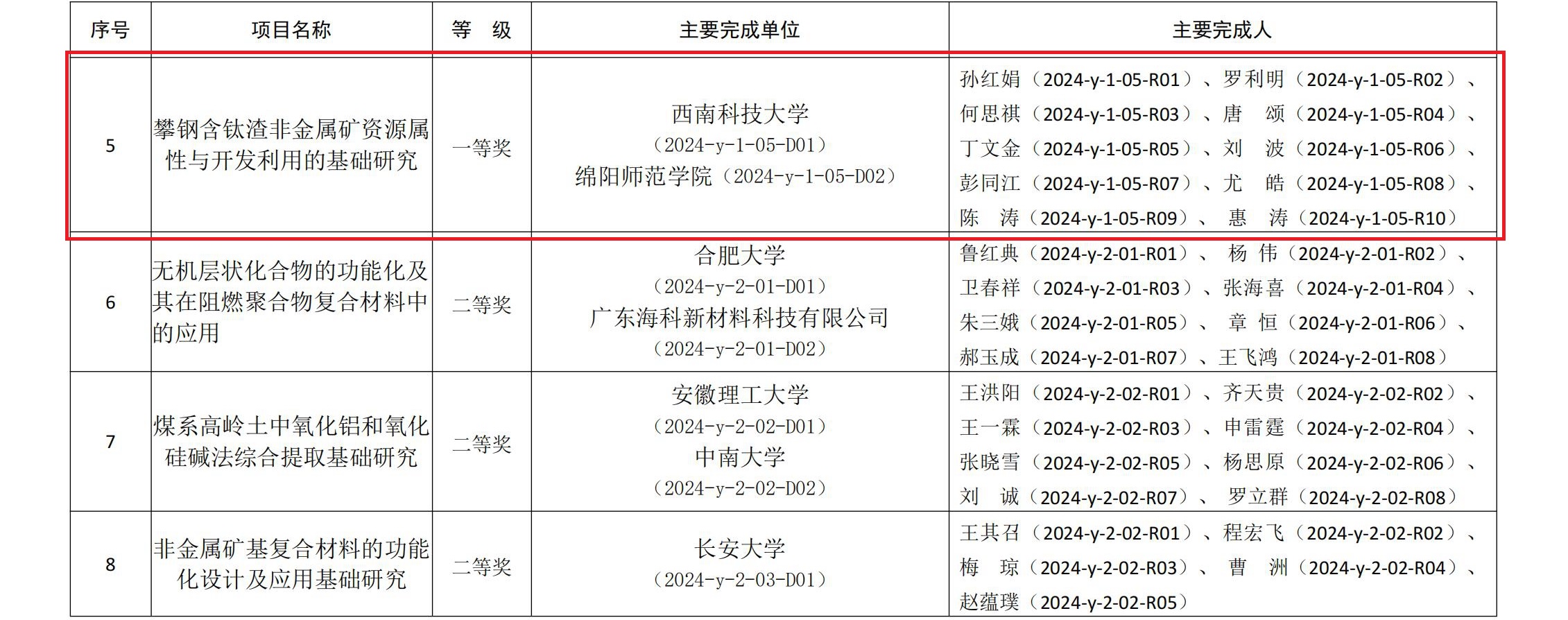 近日,中国非金属矿工业协会发布了2024年度“非金属矿科学技术奖”获奖项目名单,beat365资源环境工程学院何思祺副教授和西南科技大学联合申报的“攀钢含钛渣的非金属矿资源属性与开发利用基础研究”获得基础研究类一等奖。