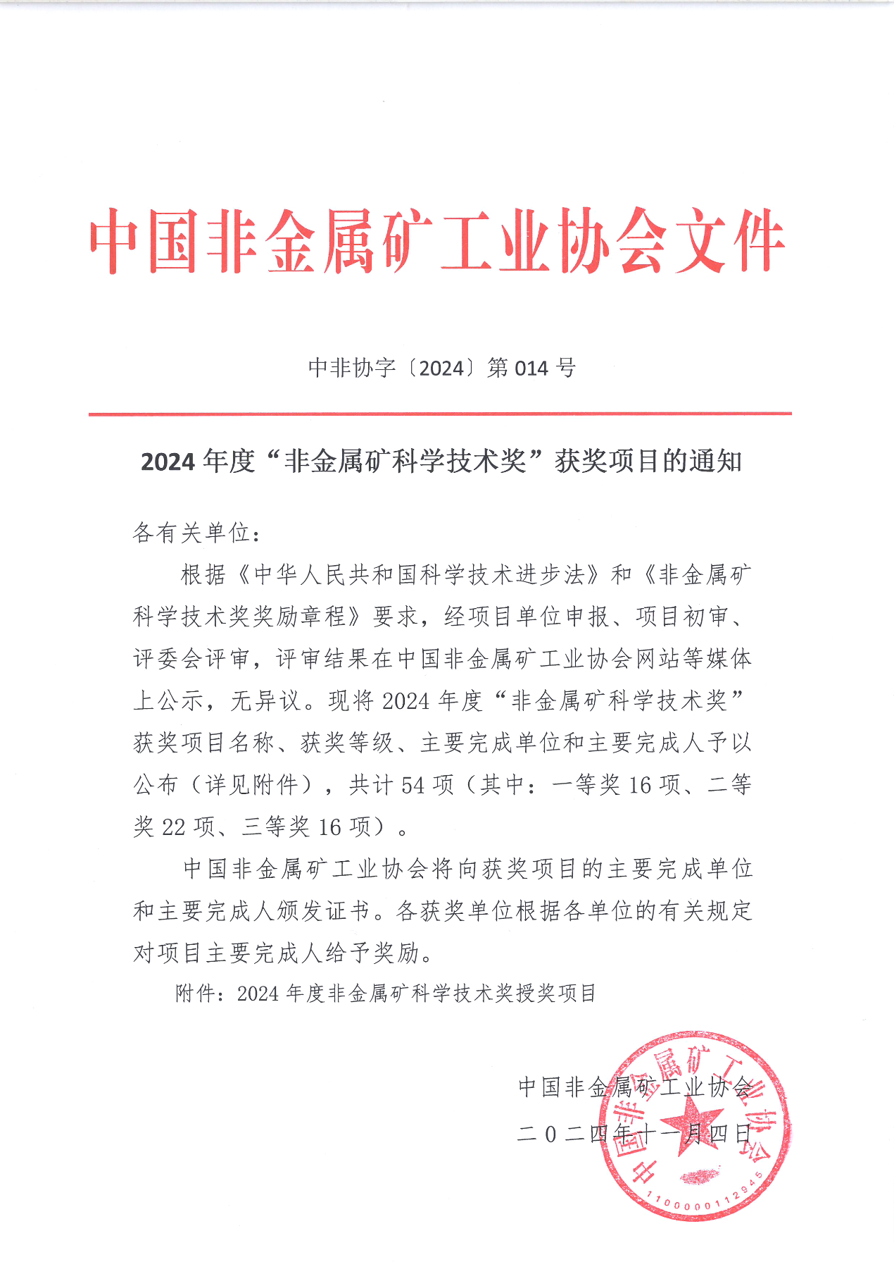 据了解,该奖项是中国非金属矿行业的最高奖项,是经科学技术部批准的社会力量设立的科学技术奖(国科奖社字0301号)。设立非金属矿科学技术奖,主要表彰在全国非金属矿行业科学研究、技术创新、成果推广、高新技术产业化等方面做出突出贡献的组织和个人。