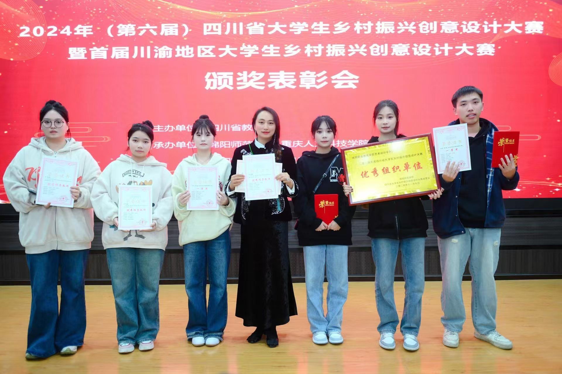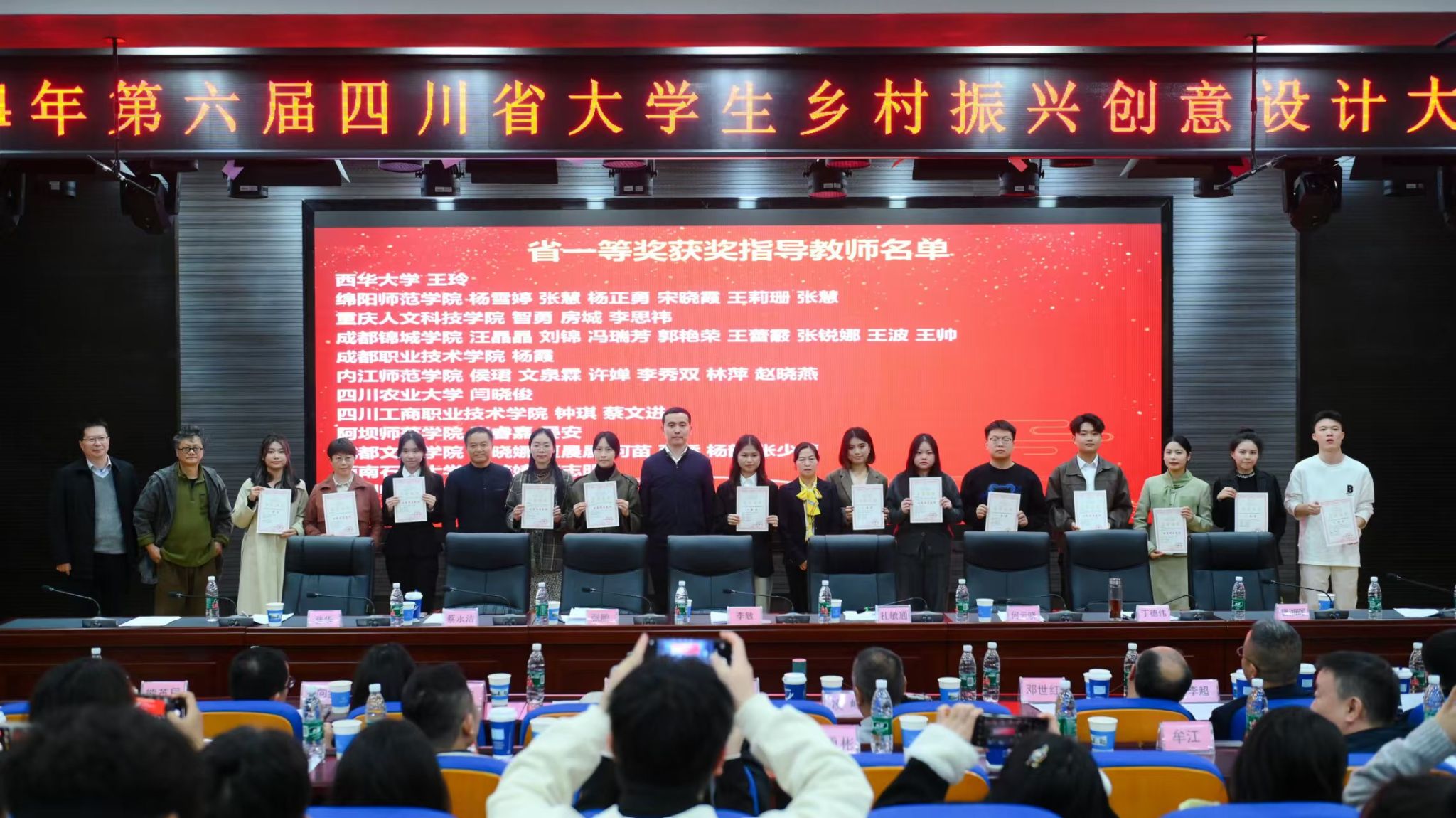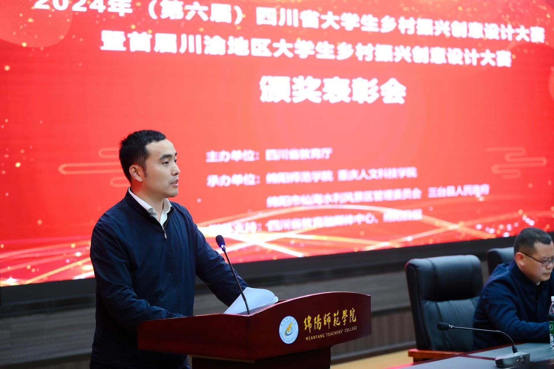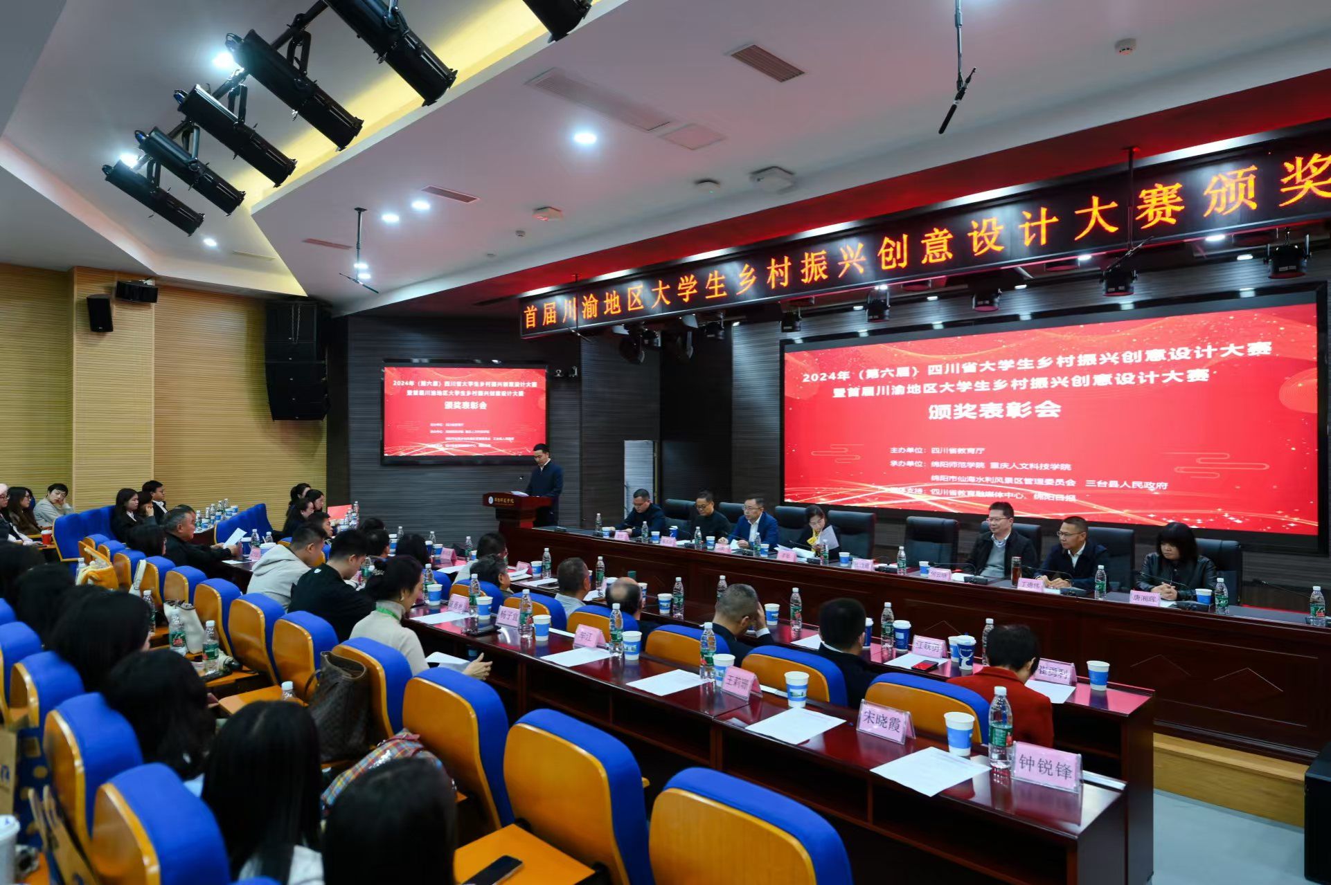11月9日下午,第六届四川省大学生乡村振兴创意设计大赛暨首届川渝地区大学生乡村振兴创意设计大赛颁奖表彰会在beat365在线唯一官网高新校区举行。此次活动由四川省教育厅主办,beat365在线唯一官网联合重庆人文科技学院、仙海水利风景区以及三台县人民政府共同承办,旨在激发青年学生的创新精神,促进高校与地方政府、企业之间的紧密合作,共同推动乡村振兴。