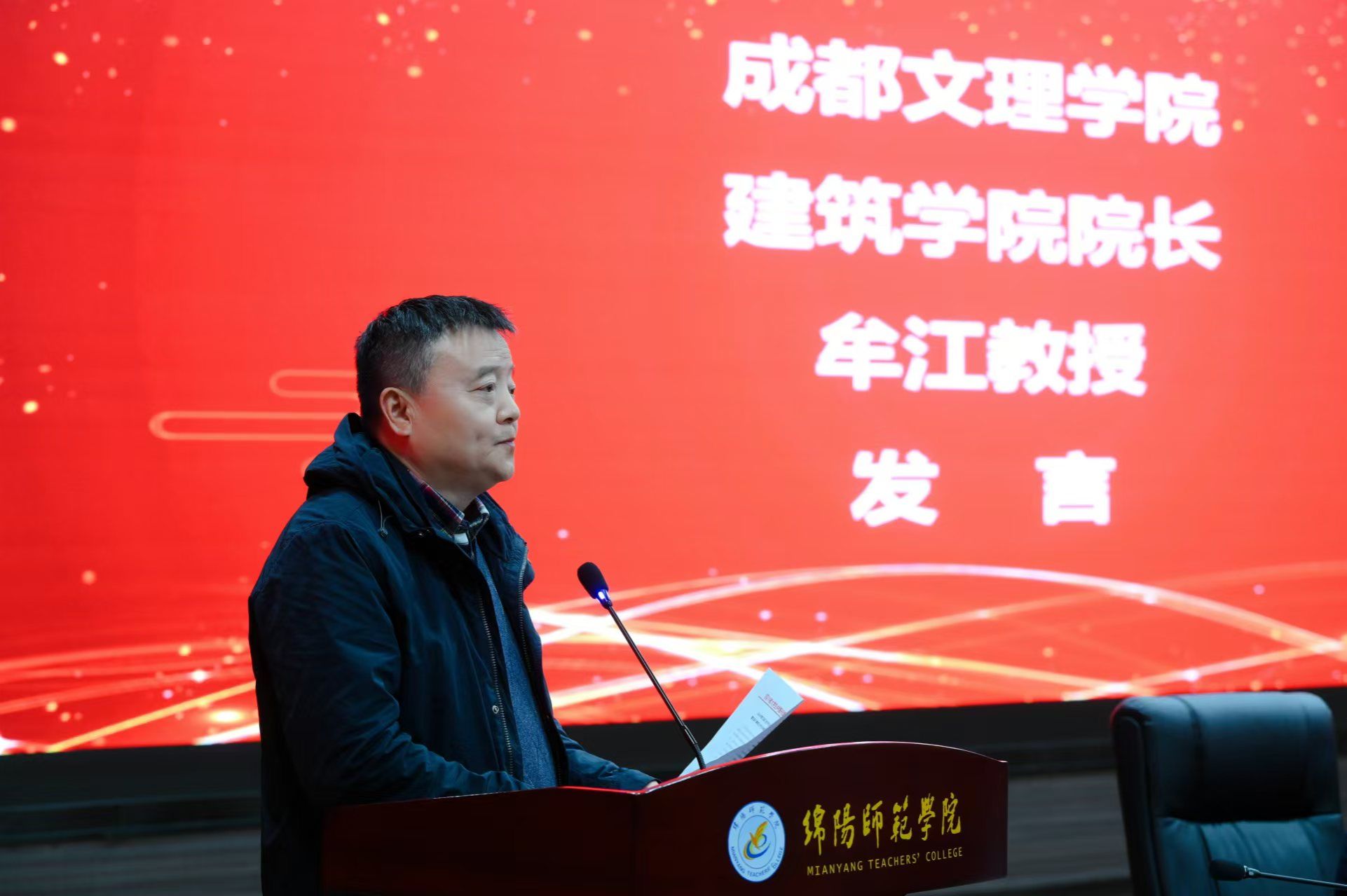 成都文理学院建筑学院院长牟江代表参赛高校发言,分享了学校通过多种措施支持学生参与社会实践活动的经验,并强调了高等教育机构在促进青年成长与发展中的关键作用。