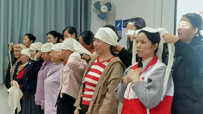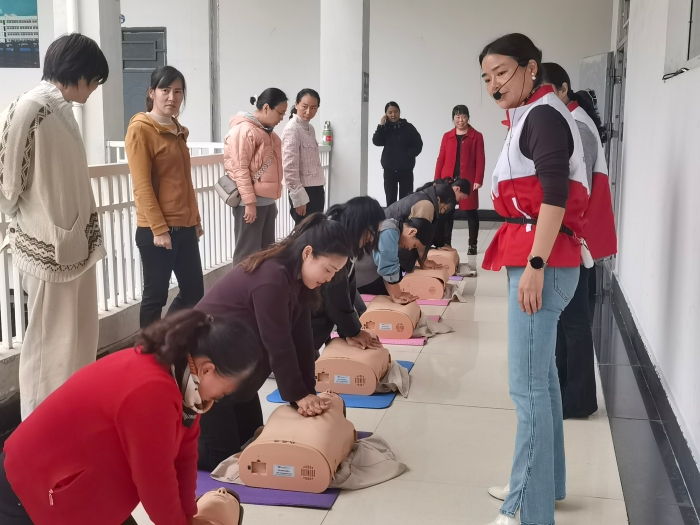 培训现场,市红十字会培训团队的讲师通过理论知识讲授、情景模拟、实操训练的方式,为教职工们讲授了心肺复苏、创伤救护、止血包扎、骨折固定等方面的救护知识。学员们学得认真,练得投入。