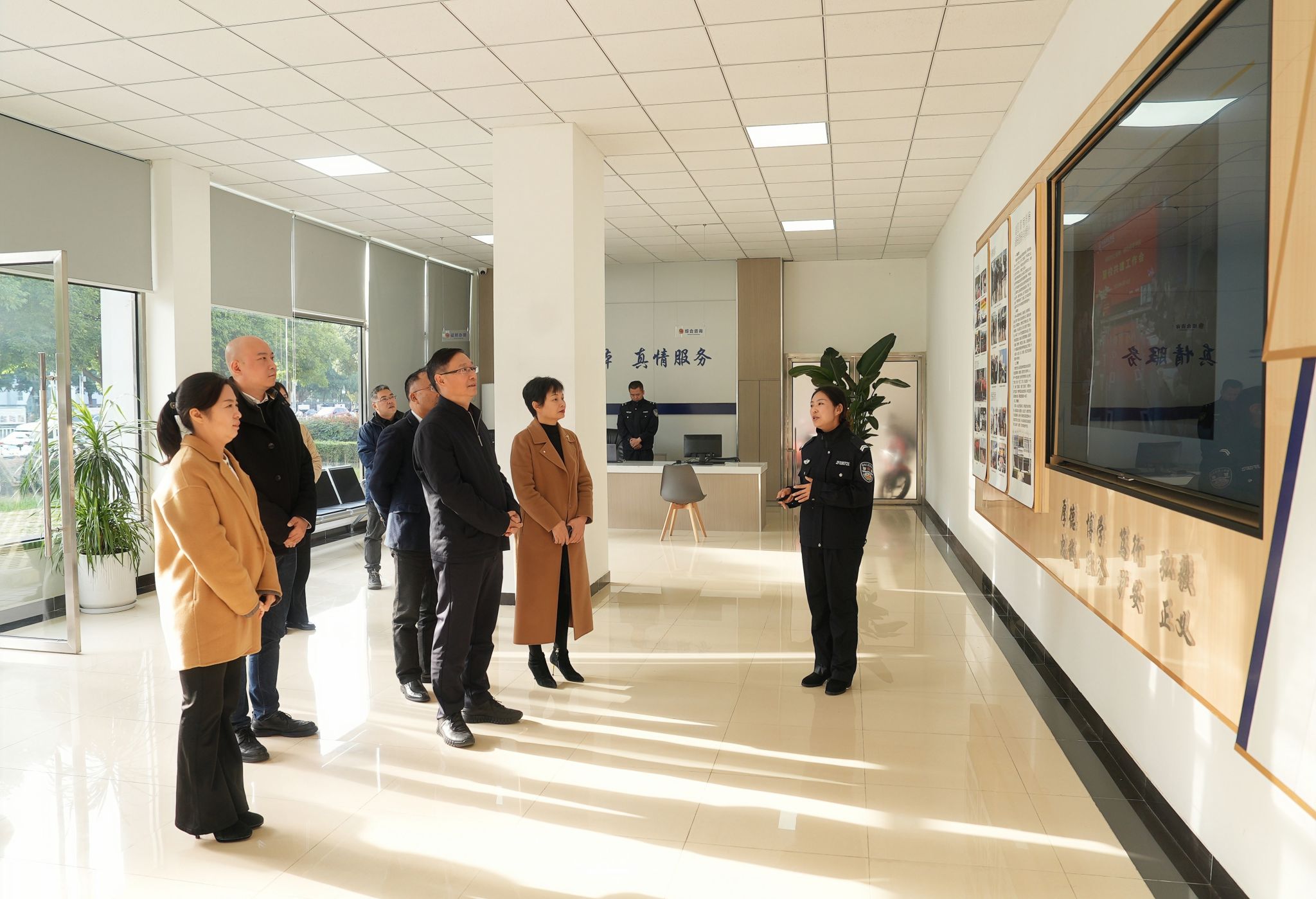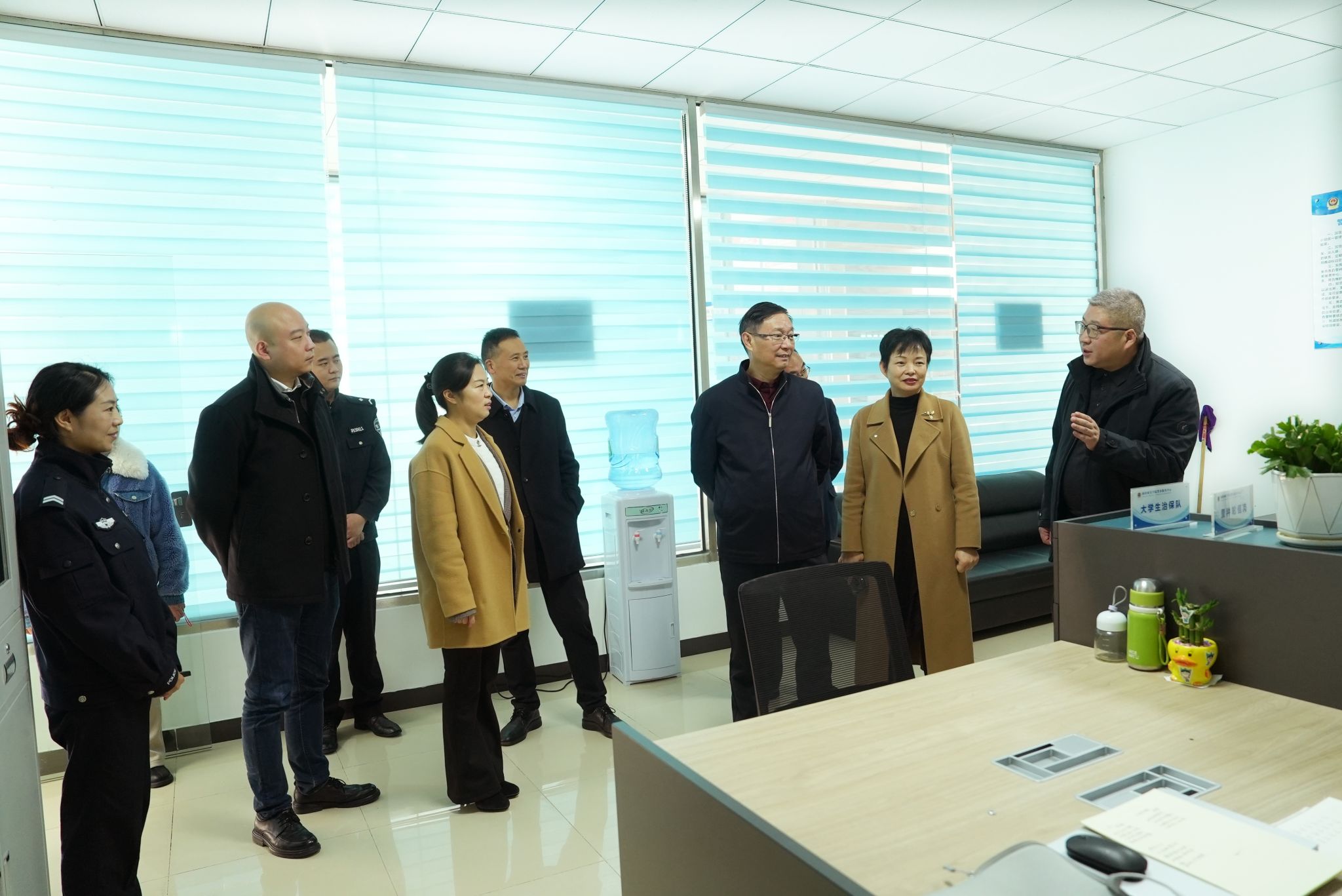 陈朝先一行参观了学校警务服务中心,详细了解了警务服务中心总体建设、功能布局、运行情况、“一三五”工作法以及学校政治安全、意识形态安全、安防设施建设、安保力量配置等方面情况。
