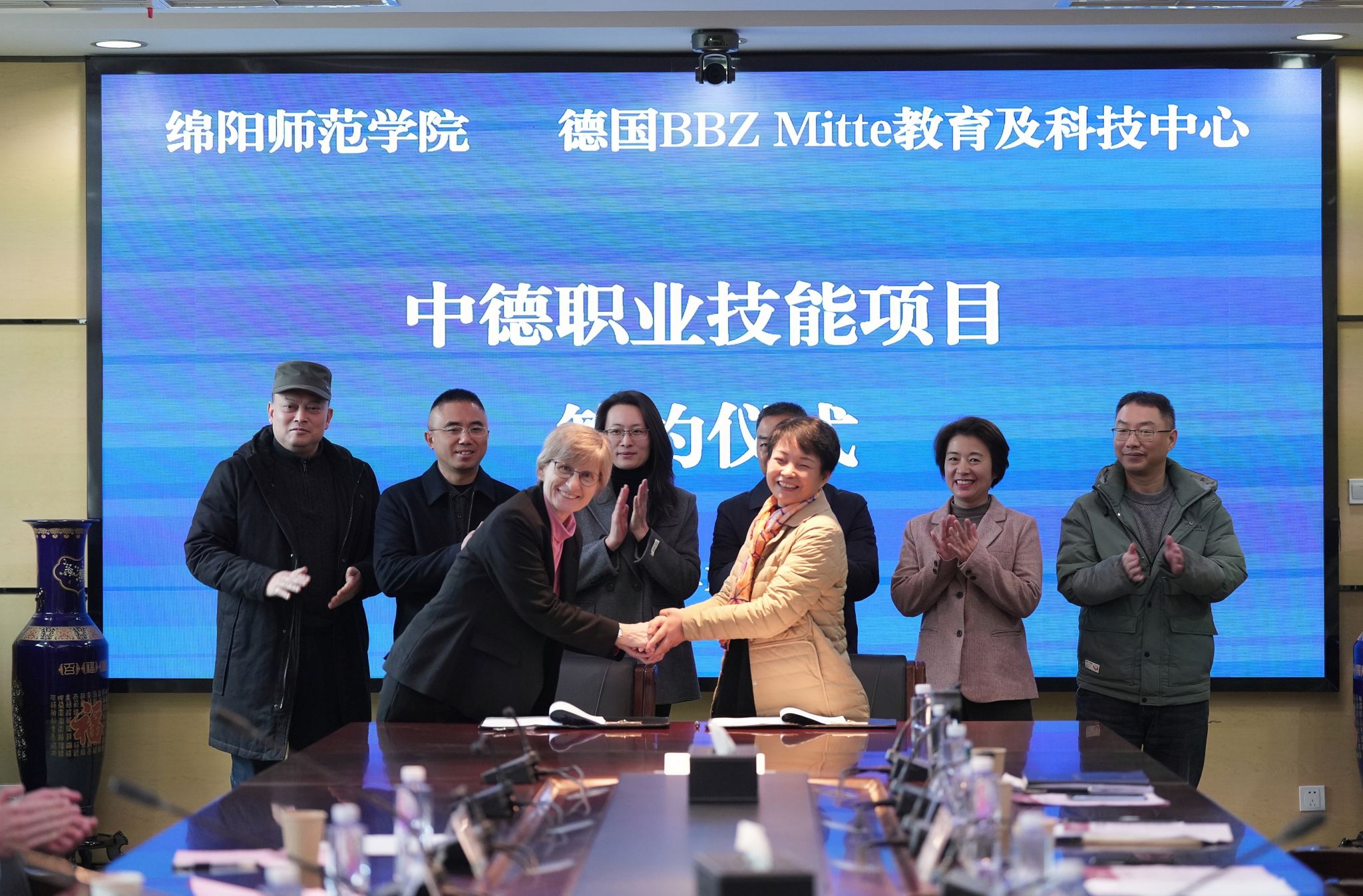 12月9日上午,德国BBZ Mitte教育及科技中心(以下简称“BBZ”)Astride Busse女士一行来beat365进行了交流访问并同beat365正式签订了《中德职业技能项目合作备忘录》。绵阳科技城社会事业局副局长周涛、绵阳科技城现代服务业促进局副局长覃琴、学校党委副书记罗娅君等出席会议。会议由国交处长郭晓飞主持。