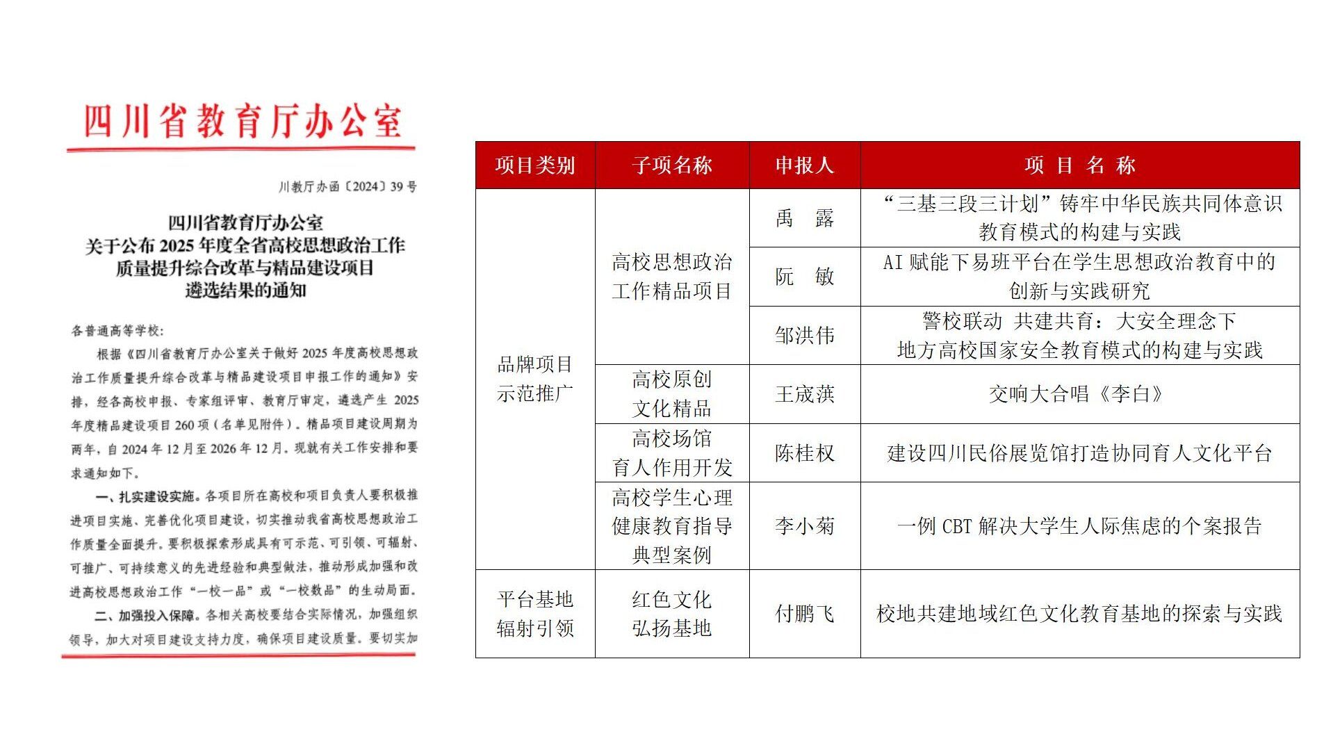 近日,四川省教育厅发布《四川省教育厅办公室关于公布2025年度全省高校思想政治工作质量提升综合改革与精品建设项目遴选结果的通知》(川教厅函〔2024〕39号),公布了2025年度四川省高校思想政治工作质量提升综合改革与精品建设项目名单,全省共遴选产生2025年度精品建设项目260项,其中beat3657个项目入选,包括高校思想政治工作精品项目3项、高校原创文化精品1项、高校场馆育人作用开发1项、高校学生心理健康教育指导典型案例1项、红色文化弘扬基地1项,立项数量取得突破性进展。
