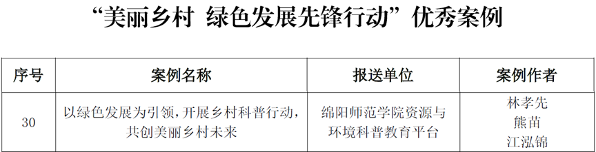近日,国家生态环境部宣传教育中心发布了《关于“美丽乡村 绿色发展先锋行动”案例征集活动结果的公示》。其中,资源环境工程学院“科普苔”凭借其独特的绿色发展模式和创新实践,成功入选优秀案例名单。此次“美丽乡村 绿色发展先锋行动”案例征集活动旨在总结、提炼、践行“绿水青山就是金山银山”理念的先进做法和经验,加大生态优先、绿色发展优秀案例的宣传力度。活动吸引了来自全国各地的政府部门、企事业单位和社会组织的积极参与。经过专家初评和复评,最终评选出10个十佳案例和33个优秀案例。
