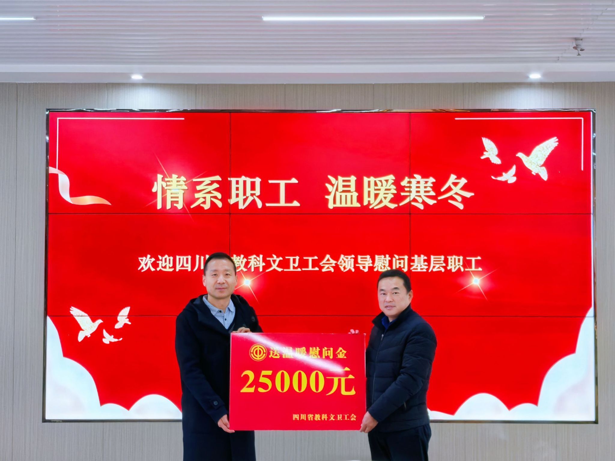 王俊兵代表省教科文卫工会向beat365送来25000元慰问金,并将省教科文卫的关怀和慰问送到了困难职工代表手中。在随后的座谈会上,王俊兵强调,“送温暖”活动是工会服务职工的重点品牌,是践行“竭诚服务职工”理念的具体举措。这一活动不仅彰显了工会关心职工生活的责任担当,也切实增强了职工的归属感和凝聚力。他鼓励两位困难教师代表坚定信心,保持乐观心态,在党和政府的关怀下,在工会组织的帮助支持下,克服眼前困难,积极走出困境,早日迎来更加美好的生活。
