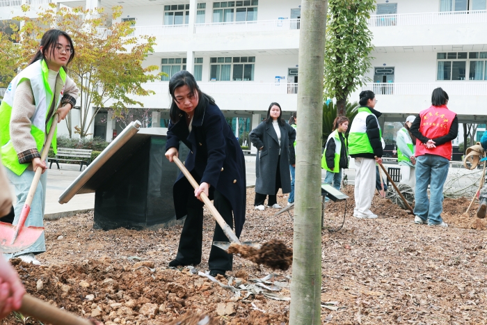 活动现场,参与植树的师生以5-6人小组为单位开展植树活动。大家挥锹铲土、扶苗填坑,围堰踩实,各个步骤有条不紊,现场一派热火朝天的劳动景象,亲手种下对学校的美好祝福和对未来的美好憧憬,共同助力绿色低碳校园建设。经过一番辛勤劳作,新栽的西府海棠树苗在春风中昂然挺立,成为校园又一抹亮丽的绿色。