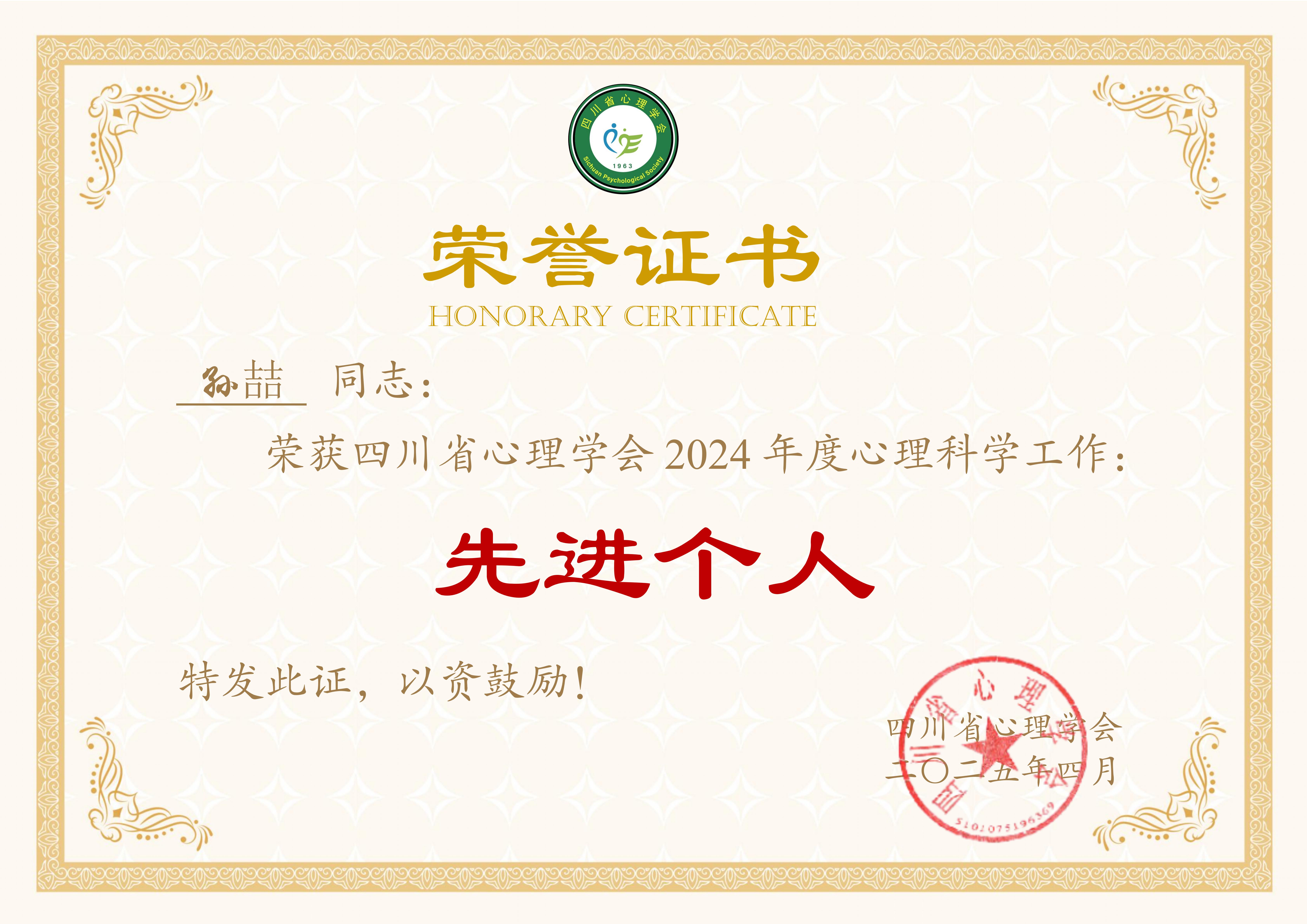 4月8日,四川省心理学会公布2024年度心理科学工作先进个人和先进集体评选结果。学校荣获“四川省心理学会2024年度心理科学工作先进集体”称号,心理健康教育专职教师孙喆荣获“四川省心理学会2024年度心理科学工作先进个人”称号。