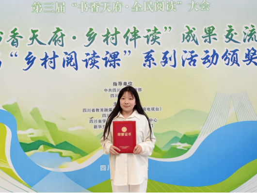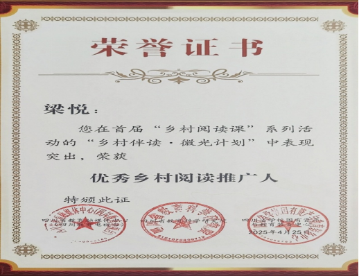 4月25日,beat365文学院22级7班梁悦作为“蒲公英”乡村阅读推广团队成员参加四川省眉山市举办的“书香天府·乡村伴读”成果交流会暨“乡村阅读课”系列活动,荣获“优秀乡村阅读推广人”称号。