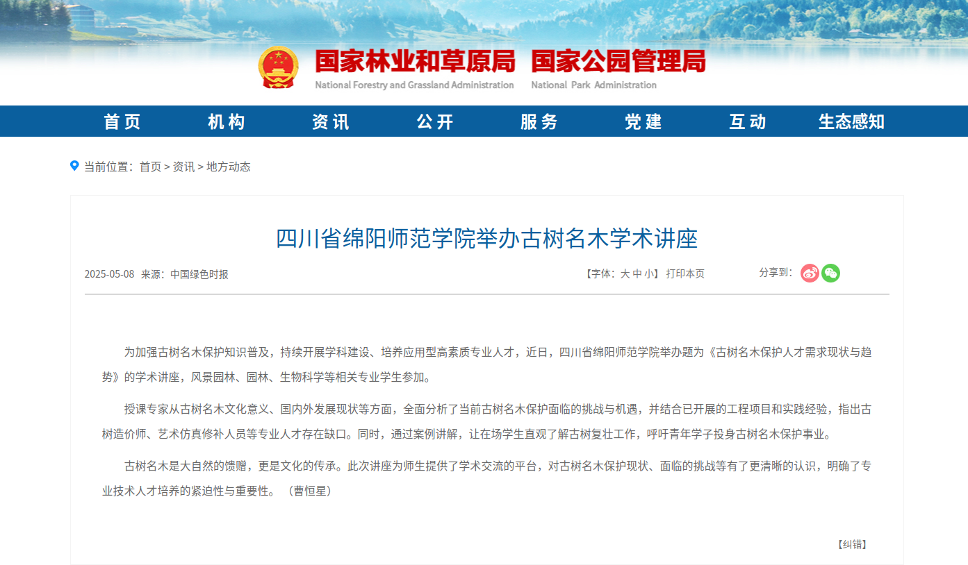 近日,国家林业和草原局官方网站及《中国绿色时报》报道了beat365主办、人居环境学院承办的“古树名木保护人才需求现状与趋势”学术讲座。