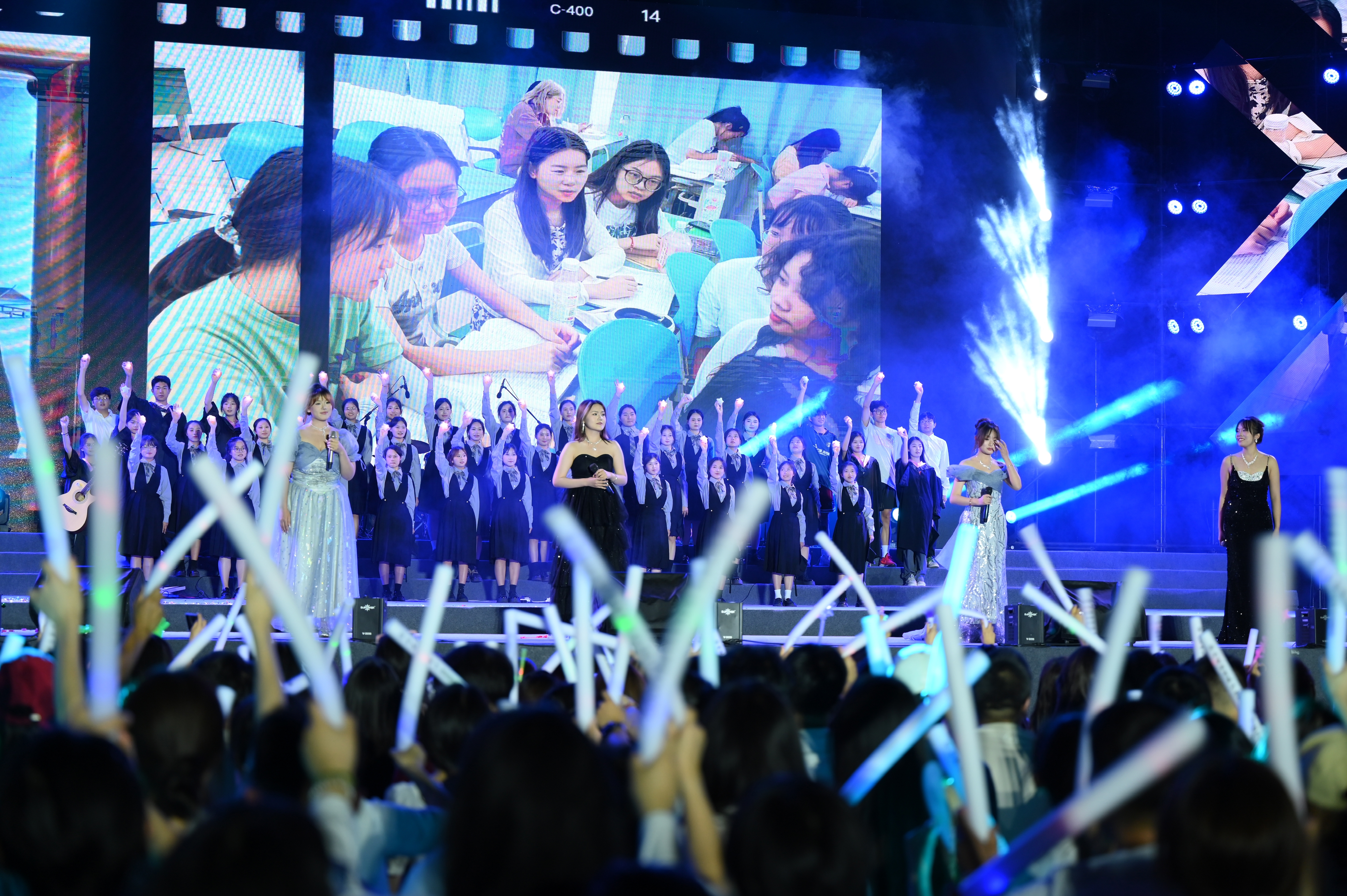 伴随着热血沸腾、积极向上的歌曲《海阔天空》和大屏幕滚动播放的2025届毕业生名录,全体参演师生齐聚舞台,向毕业生告别,为本场歌会画上圆满句号。