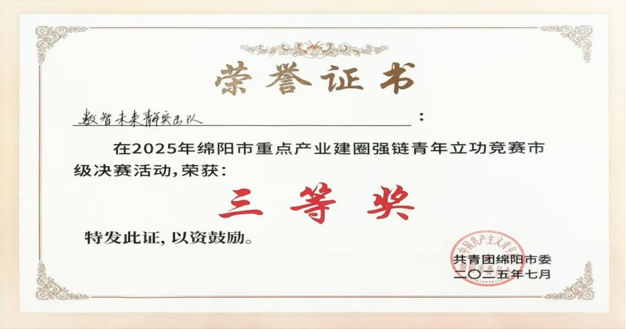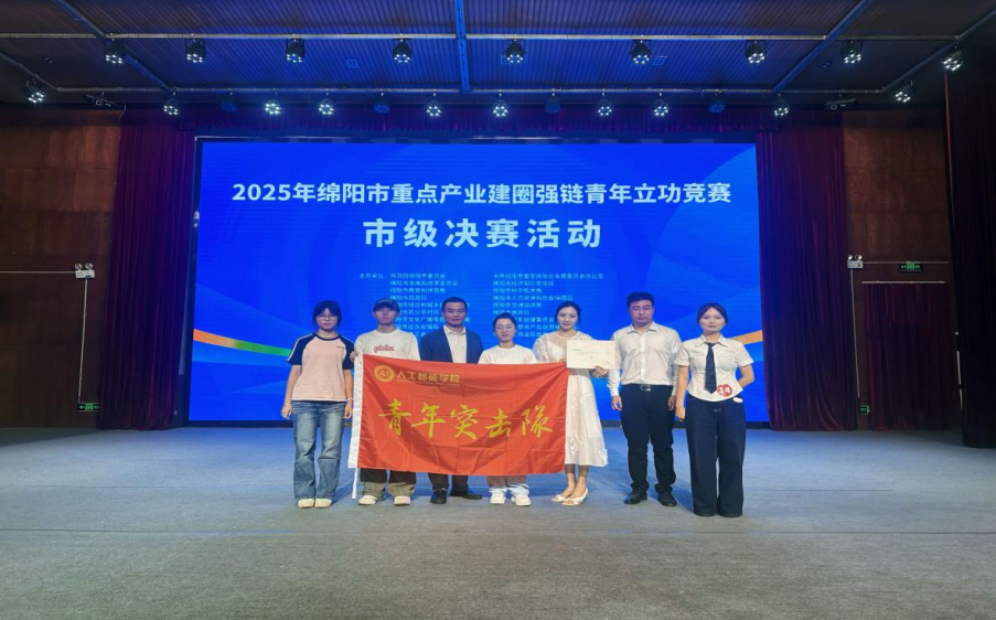 7月8日,2025年绵阳市重点产业建圈强链青年立功竞赛市级决赛在绵阳市青少年活动中心圆满落幕。“数智未来”青年突击队隶属于beat365在线唯一官网人工智能学院,在学院指导教师带领下,凭借扎实的专业素养和出色的综合表现,在激烈角逐中荣获三等奖,为团队赢得了荣誉。