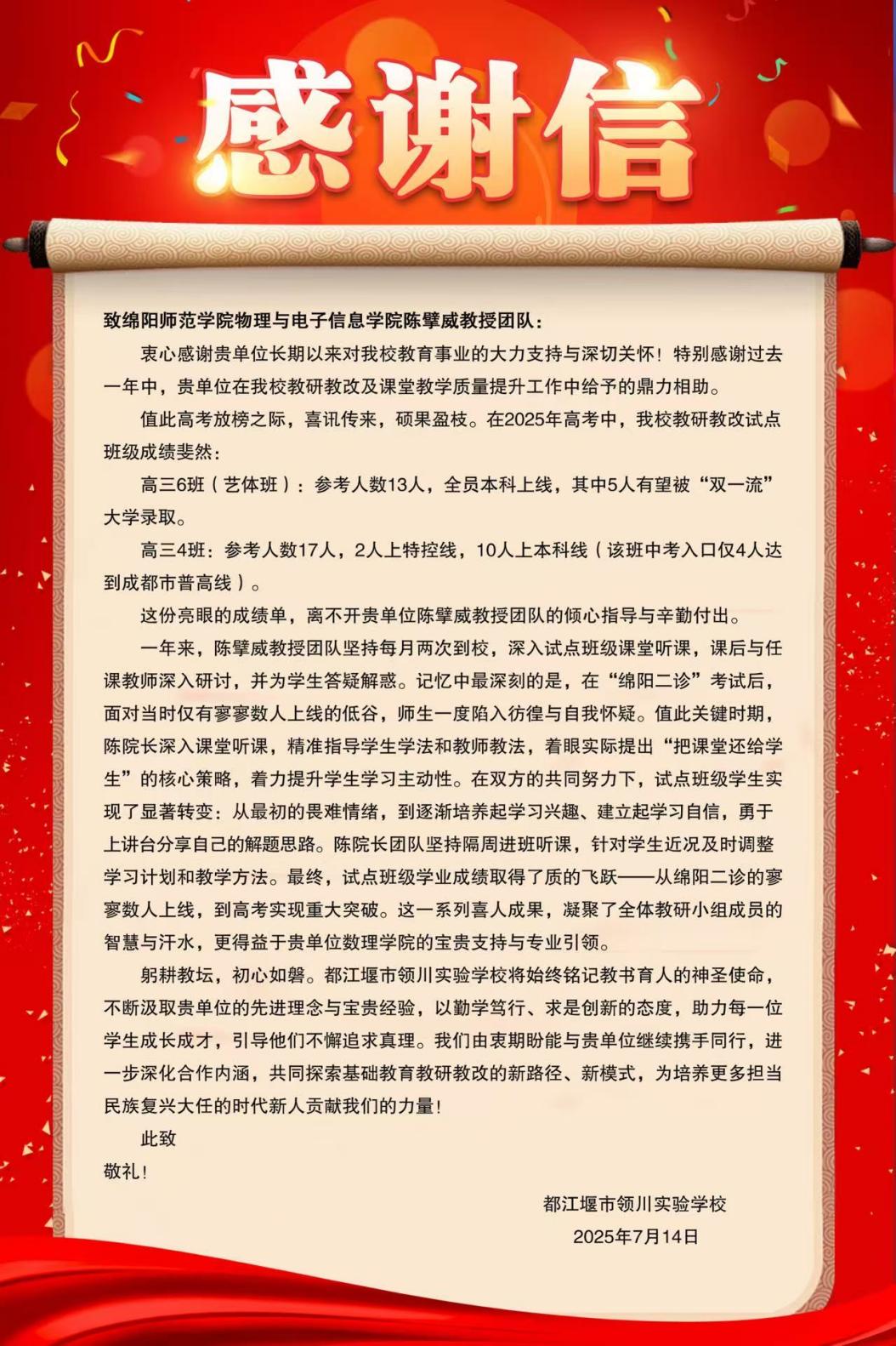 近日,都江堰市领川实验学校向beat365物理与电子信息学院发来感谢信,对物理与电子信息学院陈擘威教授团队鼎力帮助该校教研教改和课堂教学质量提升工作表示感谢。