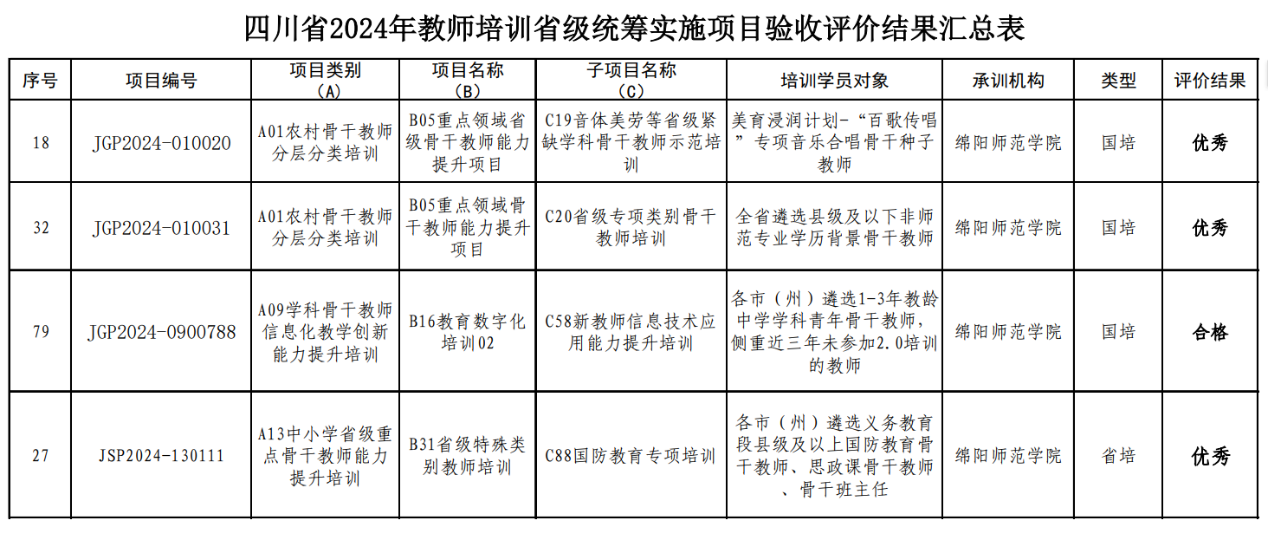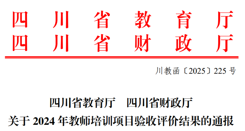 近日,四川省教育厅、四川省财政厅联合发布《关于2024年教师培训项目验收评价结果的通报》(川教函〔2025〕225号),beat365承训的四个项目在本次省级验收评价中取得“3优1合格”的优异成绩。这一成果不仅体现了学校一直以来对培训效果的卓越追求,更彰显了学校在服务四川基础教育、推动教师专业发展方面的深厚实力与坚定承诺。