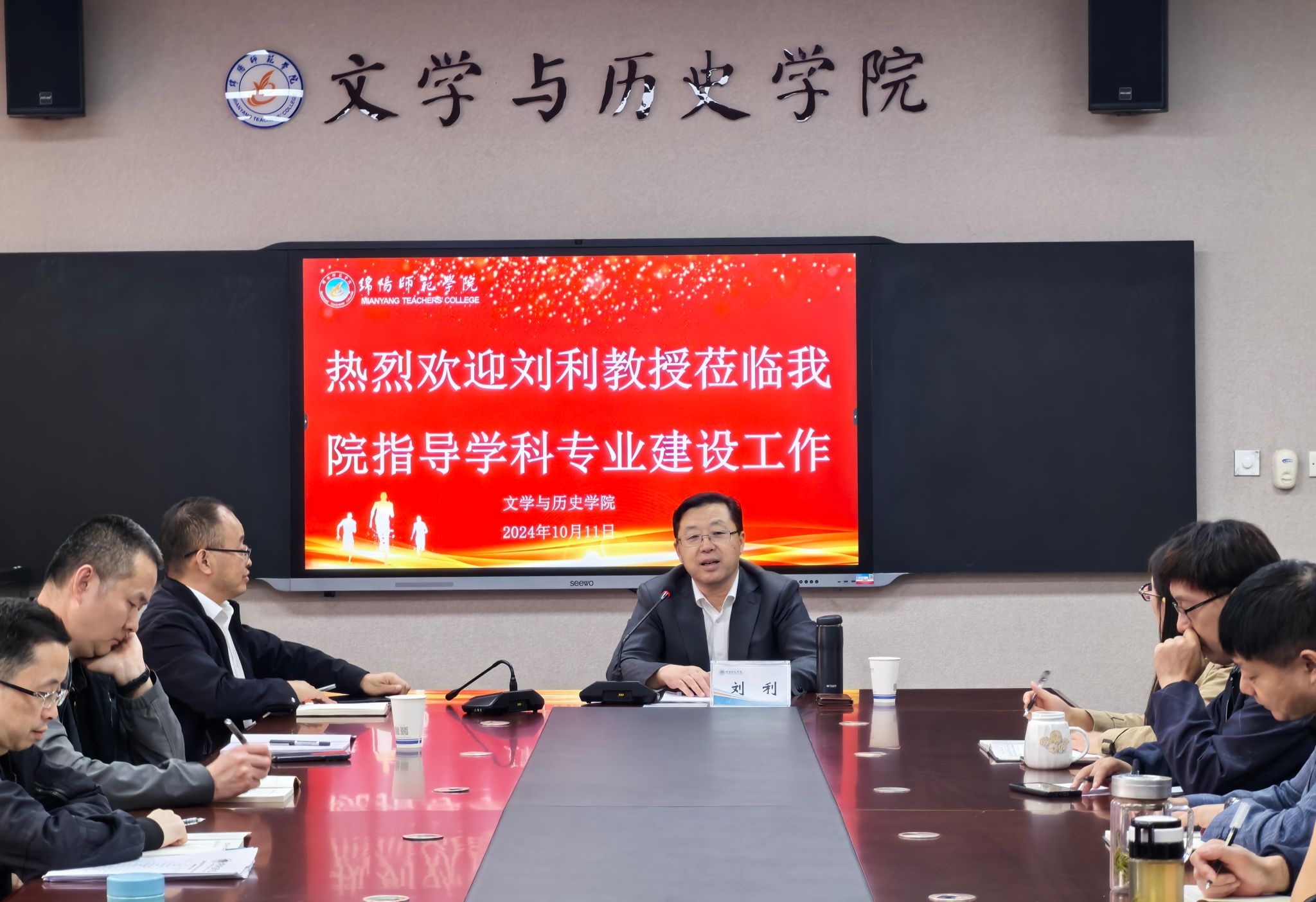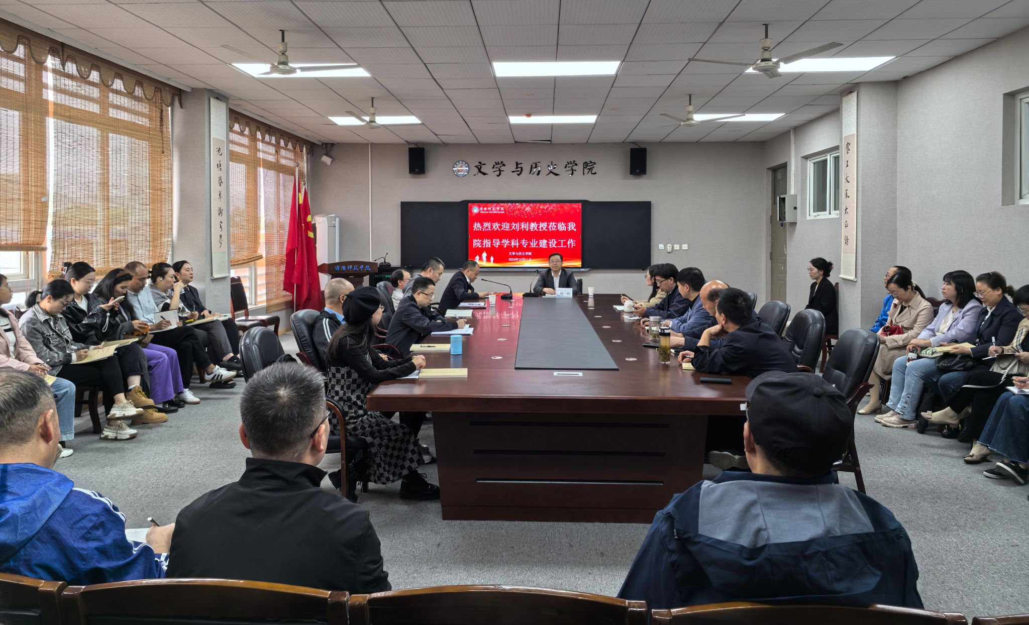 10月11日下午,北京师范大学博士生导师刘利教授莅临beat365指导学科建设工作并在弘文楼419会议室作学科与学位点建设专题报告。文学与历史学院和李白中心全体教职工到场聆听。会前,学校党委副书记、校长李敏在弘文楼427会见来宾并亲切交流。